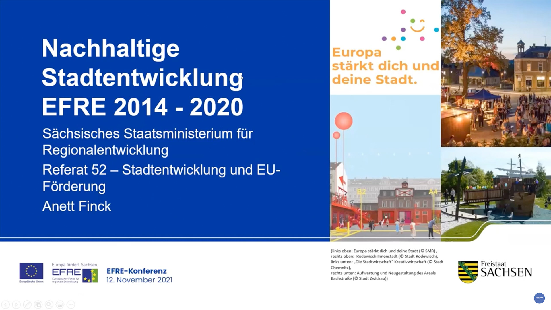 Wie hat Sachsens Forschungs- und Unternehmerlandschaft vom EFRE profitiert? Was hatten Bürger, Kommunen und Umwelt in Sachsen vom EFRE? Bei der großen EFRE-Online-Konferenz am 12. November gab es eine Bilanz der Förderung 2014 bis 2020 mit vielen anschaulichen Beispielen sowie einen Ausblick auf den Förderzeitraum 2021 bis 2027.