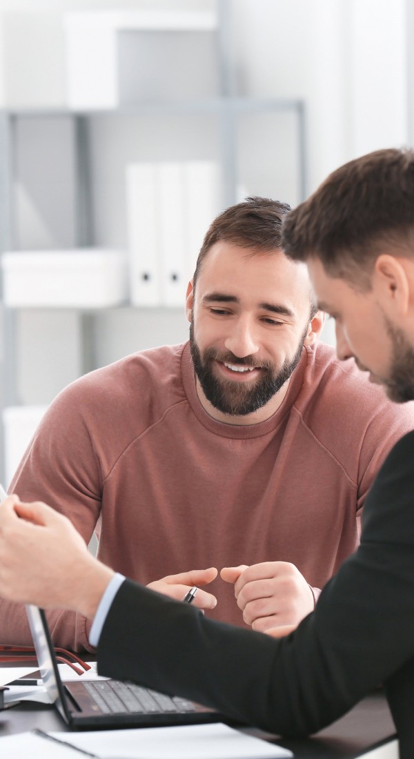 Ein Berater erklärt am Laptop einem jungen Kunden das Angebot