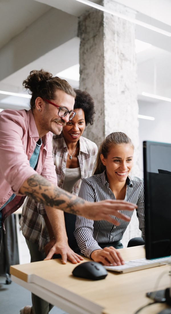 Ein Mann und zwei Frauen bei einer Besprechung am Computer