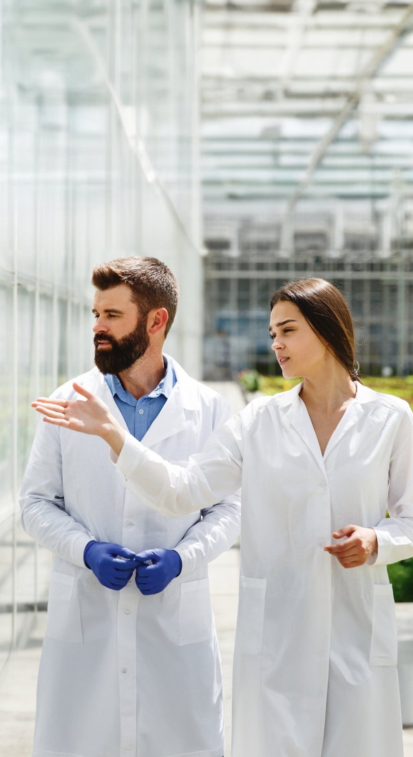 Ein männlicher und ein weiblicher Wissenschaftler*in gehen durch ein Gewächshaus