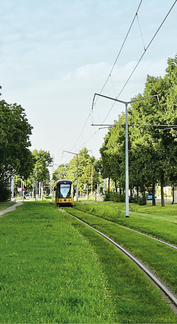 Straßenbahn auf grünem, mit Rasen bewachsenem Gleisbett